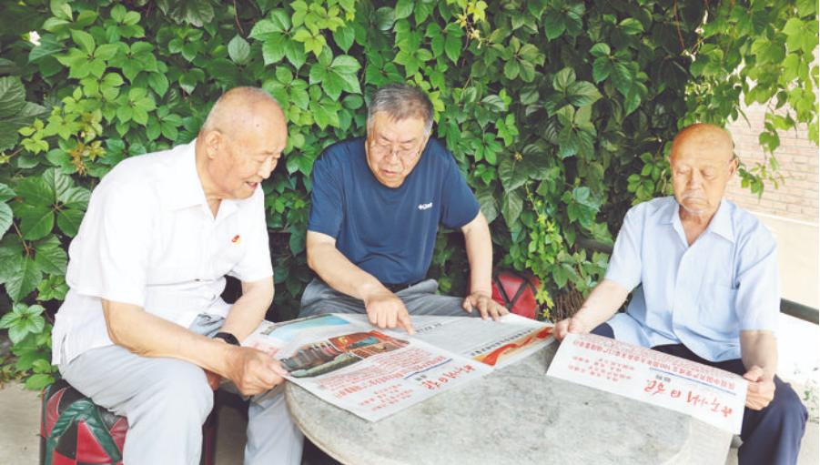 7月5日,在原市廣播局家屬院,老黨員們正在學習習近平總書記“七一”重要講話。(張存良 攝)