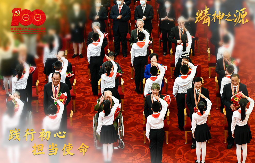 6月29日,慶祝中國共產(chǎn)黨成立100周年“七一勛章”頒授儀式在北京人民大會堂金色大廳隆重舉行。這是少先隊員向勛章獲得者獻(xiàn)花,敬禮致意。
