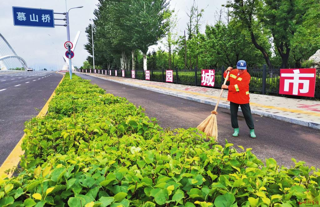 7月12日,云中河風(fēng)景區(qū)保潔員正在清掃路面。昨日的連續(xù)強降雨天氣,使個別路段除了落葉,新增泥濘。環(huán)衛(wèi)工人一早清掃,保景區(qū)環(huán)境整潔。(宮清華 攝)