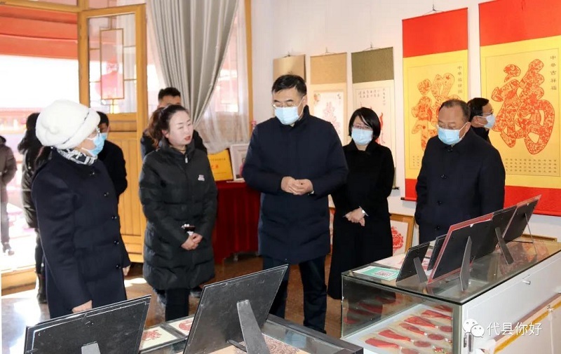 在代縣非物質(zhì)文化遺產(chǎn)展廳,李建國先后參觀了楊氏古建、望臺磚雕、雁剪閣、雁晶刺繡、藍花工作室、華嚴藝術(shù)世界、天順昌泥塑、曉玲面塑、葉玲瓏和雁繡坊等展廳。李建國與從業(yè)藝術(shù)工作者親切交談,希望他們不斷淬煉技藝,進一步提升產(chǎn)品藝術(shù)價值,研究消費對象的需求,借鑒南方和其它非遺研發(fā)發(fā)達地市的先進經(jīng)驗,將產(chǎn)業(yè)做得更大更強。