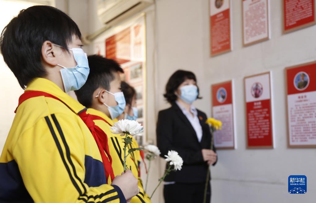 4月4日,在河北省邢臺市襄都區(qū)東郭村鎮(zhèn)北陳村社區(qū)英烈事跡館,學(xué)生敬獻(xiàn)鮮花緬懷先烈。