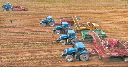 去年秋季,五寨縣現(xiàn)代加工型馬鈴薯種植示范基地里,聯(lián)合收割機在緊張作業(yè)。 張向榮攝