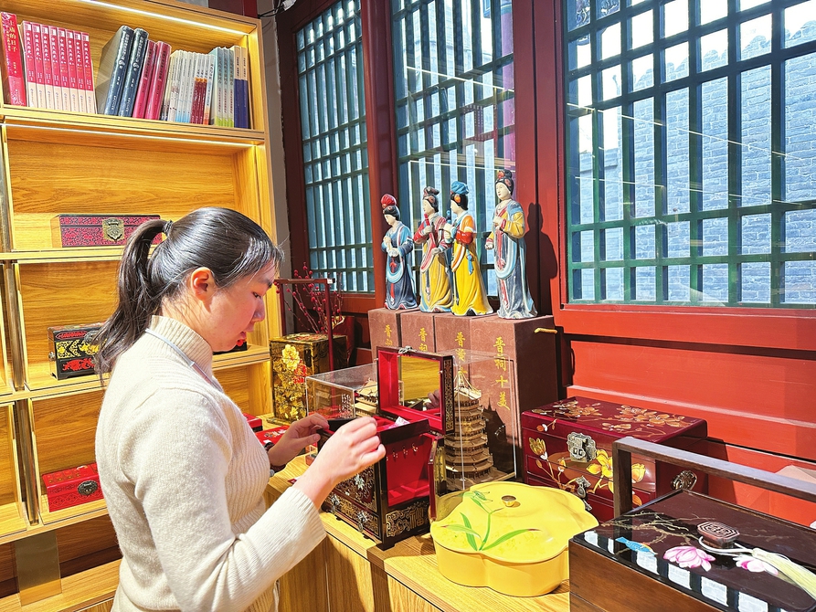 山西非遺文創(chuàng)館工作人員倪博珺正在整理平遙推光漆器首飾盒。