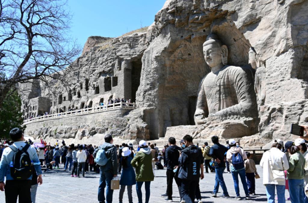 ▲2023年5月,游客在大同云岡石窟游覽。云岡石窟的開鑿始于北魏時期,為中國規(guī)模最大的古代石窟群之一,與敦煌莫高窟、洛陽龍門石窟和天水麥積山石窟并稱為中國四大石窟藝術(shù)寶庫。山西日報記者劉通攝