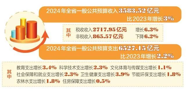 收支管理是財(cái)政工作的核心。按照政府預(yù)算報(bào)告,2024年全省一般公共預(yù)算收入3583.52億元,比2023年增長(zhǎng)3%。其中,稅收收入2717.95億元,增長(zhǎng)6.3%;非稅收入865.57億元,下降6.2%。全省一般公共預(yù)算支出6527.15億元,比2023年增長(zhǎng)2.2%。其中,教育支出增長(zhǎng)3.4%,科學(xué)技術(shù)支出增長(zhǎng)2.3%,文化體育與傳媒支出增長(zhǎng)1.1%,社會(huì)保障和就業(yè)支出增長(zhǎng)2.3%,衛(wèi)生健康支出增長(zhǎng)3.9%,節(jié)能環(huán)保支出增長(zhǎng)1.8%,農(nóng)林水支出增長(zhǎng)1.8%,住房保障支出增長(zhǎng)0.5%。