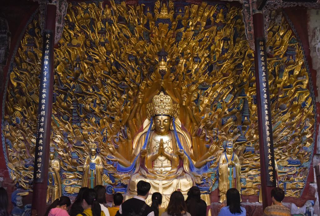 1952年,大足石刻文物保護(hù)機(jī)構(gòu)成立,開始系統(tǒng)科學(xué)保護(hù)大足石刻。當(dāng)年,北山石刻保護(hù)長廊啟動建設(shè),北山石刻上方加蓋了擋雨的頂棚;1961年,北山、寶頂山摩崖造像成為第一批全國重點(diǎn)文物保護(hù)單位;1999年,大足石刻被列入《世界遺產(chǎn)名錄》;2015年,全國石質(zhì)文物保護(hù)一號工程——大足石刻千手觀音造像搶救性保護(hù)工程竣工;2019年,《大足石刻全集》出版,填補(bǔ)了國內(nèi)石窟寺編寫出版大型考古報(bào)告的空白……