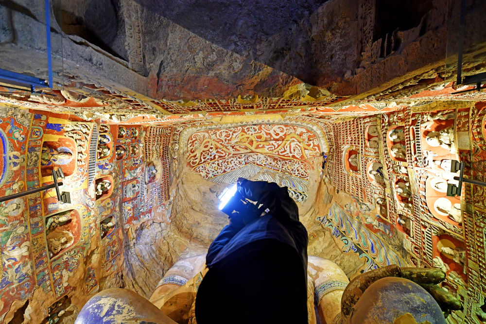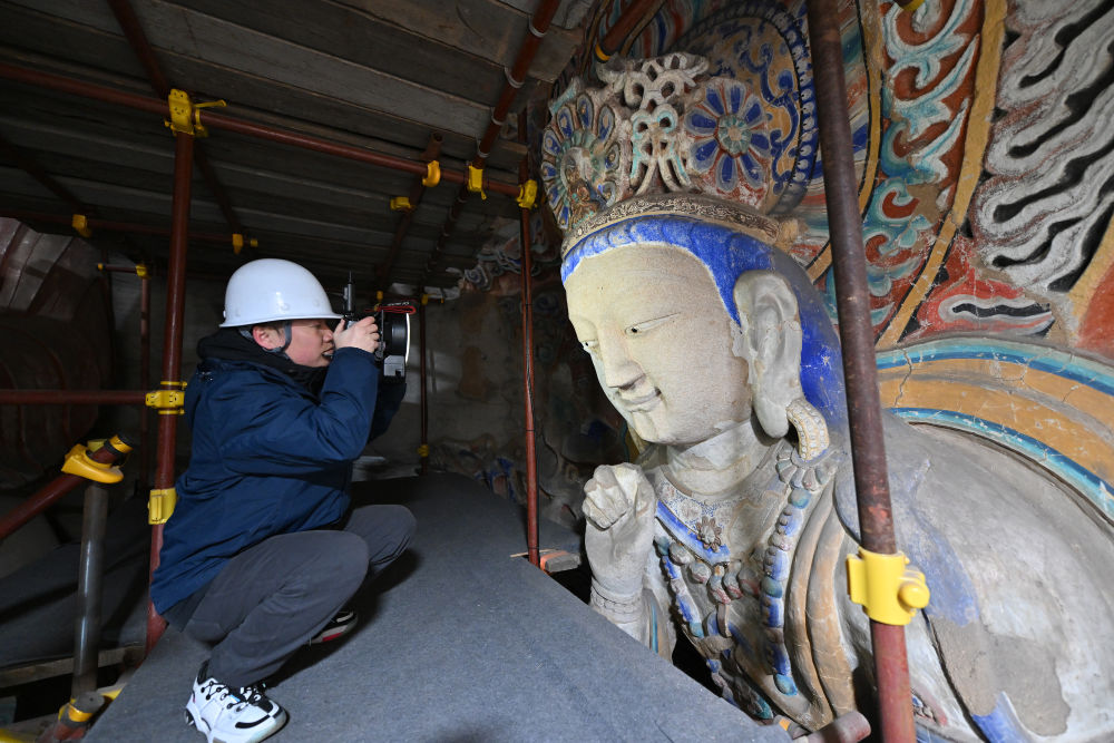 云岡研究院數(shù)字化保護中心工作人員潘鵬(前)和同事杜強在云岡石窟第10窟進行數(shù)據(jù)采集(2024年2月27日攝)。
