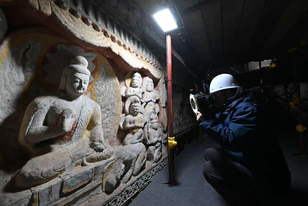 云岡研究院數(shù)字化保護中心工作人員李敏在進行影像采集(2024年2月27日攝)。