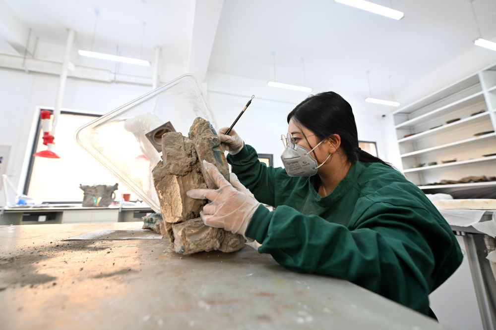 在云岡研究院可移動文物修復室,工作人員韓躍華在進行除塵作業(yè)(2024年2月26日攝)。