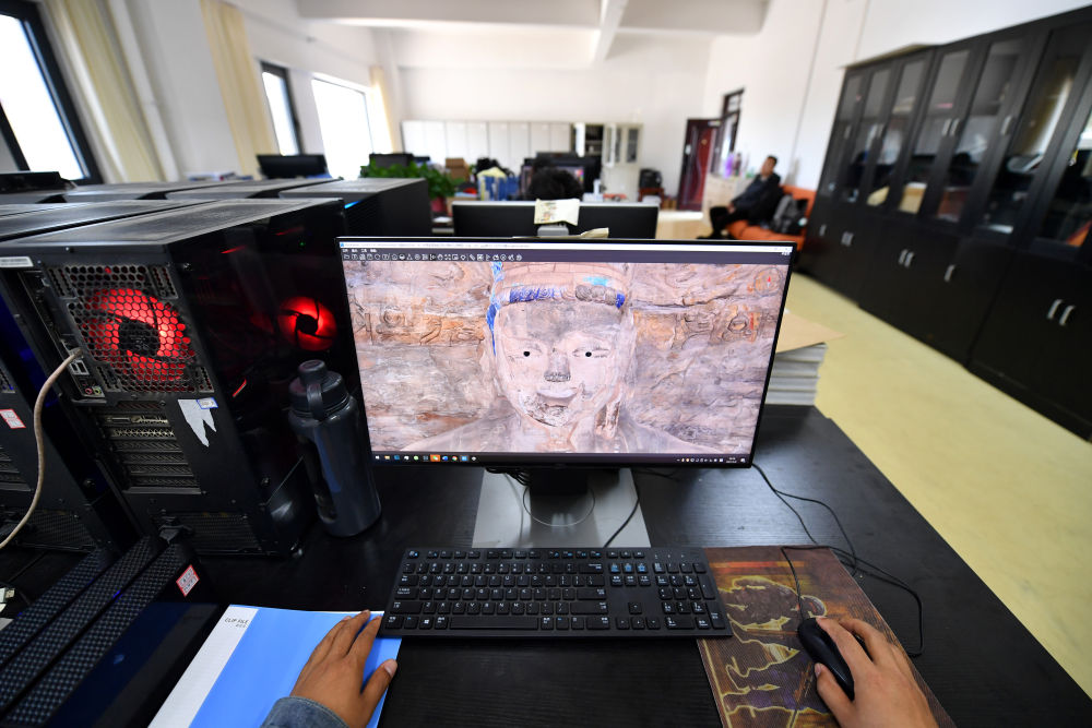 云岡研究院數(shù)字化保護中心工作人員在電腦上查看云岡石窟第13窟的模型(2021年5月8日攝)。