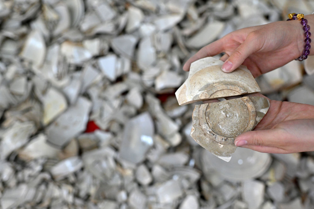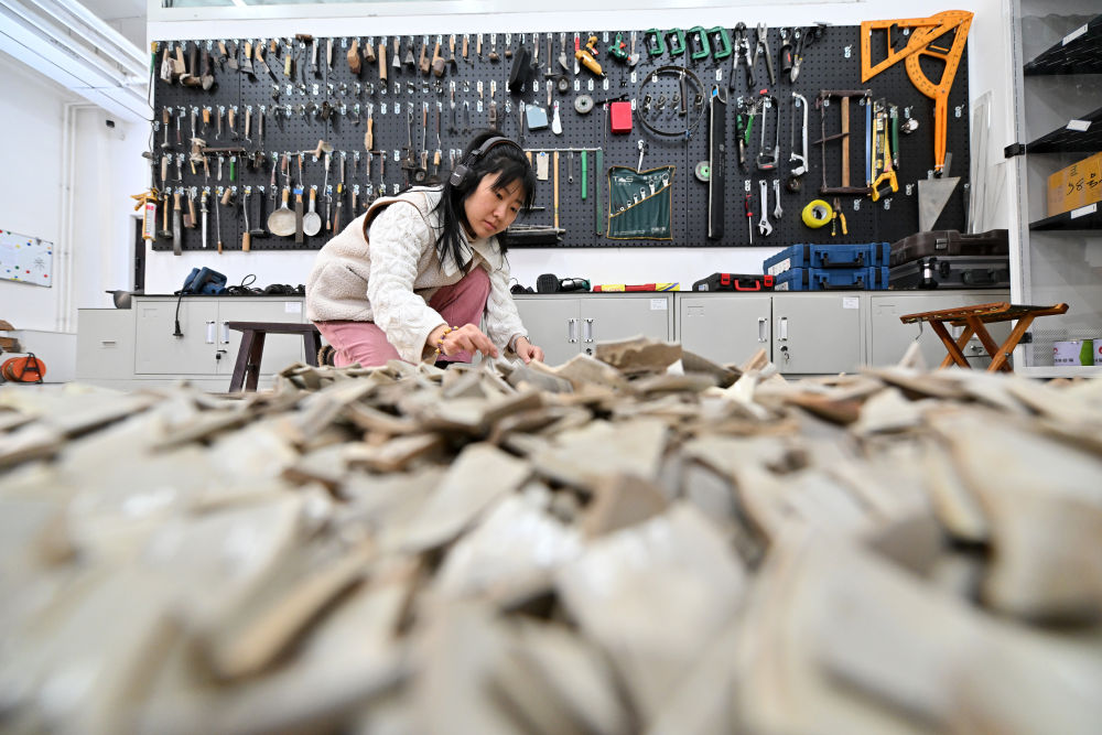 在云岡研究院可移動文物修復室,工作人員高嘉珩在進行瓷器修復(2024年2月26日攝)。