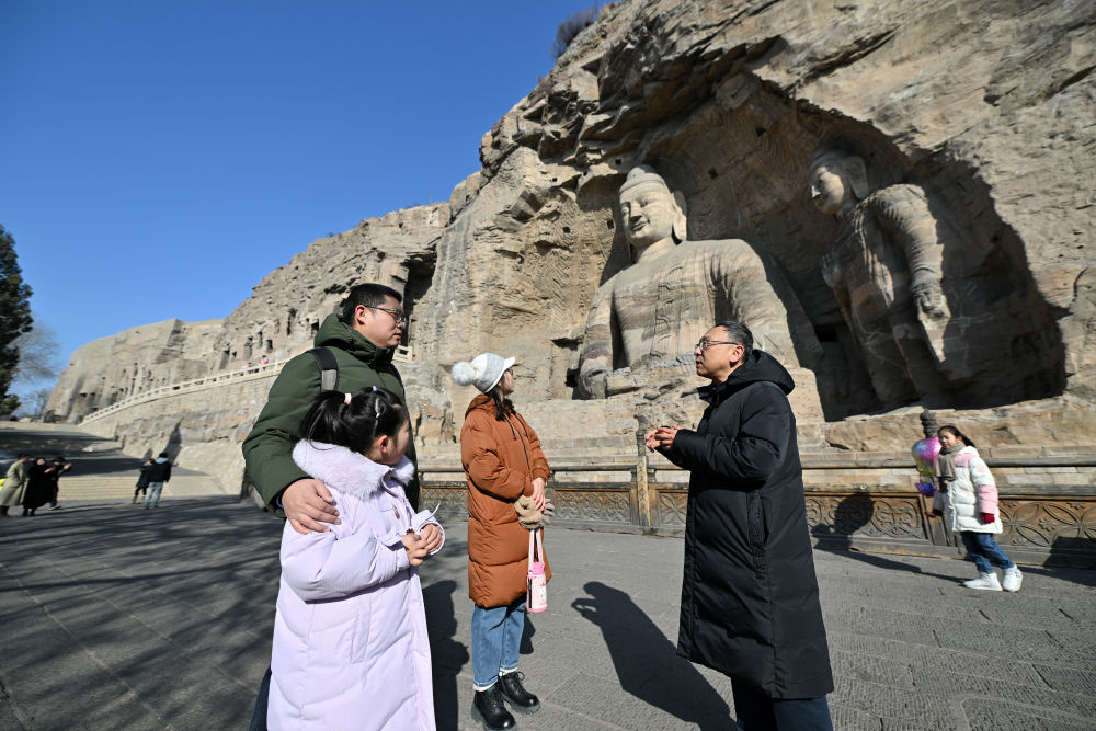 云岡研究院院長杭侃(左)在給游客講解石窟的歷史知識(2024年2月25日攝)。