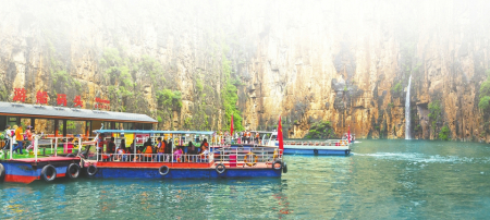伴隨著他的講解,穿過(guò)800米的“時(shí)空隧道”,八泉峽山清水秀的核心地帶就躍然眼前了。3000米長(zhǎng)的游船觀光水路時(shí)寬時(shí)窄,順流而下,游船上靜聽(tīng)水流鳥鳴,看水中游魚穿梭而過(guò),高峽平湖間,隨手一拍即是如畫美景,或碧波蕩漾,或山崖高聳,平靜的湖面與對(duì)峙的高山形成鮮明對(duì)比,不負(fù)“抬頭張家界,低頭九寨溝”之美名。