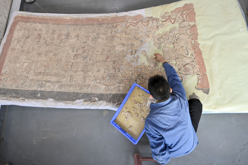 4月15日,在云岡研究院壁畫文物修復(fù)室,工作人員戴宇翔在修復(fù)壁畫。