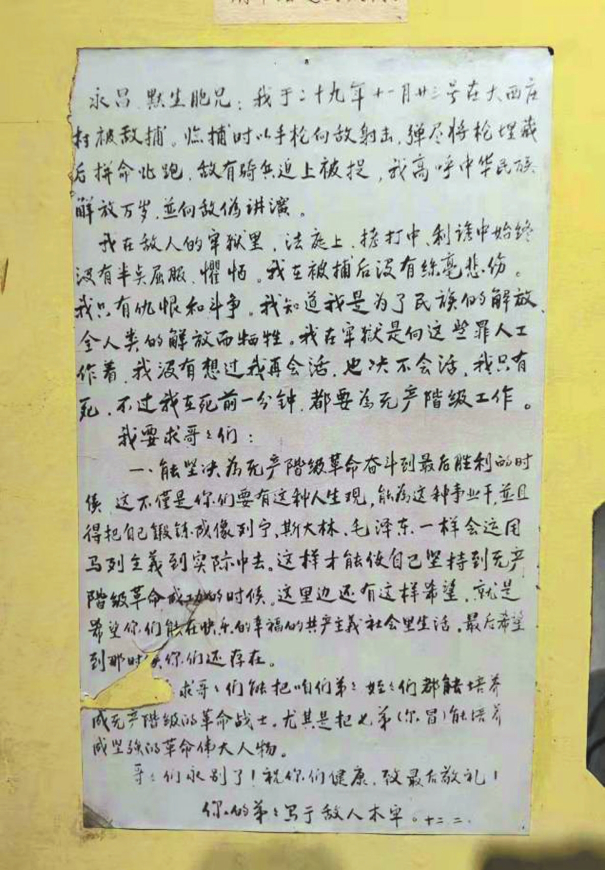 遺書中,表達(dá)了對抗戰(zhàn)勝利的必勝信心;直言“我死了是為國家為民族而犧牲”,以生命詮釋對黨的忠誠,展現(xiàn)了共產(chǎn)黨人堅(jiān)貞不屈的崇高革命精神與為共產(chǎn)主義奮斗終身的犧牲精神。